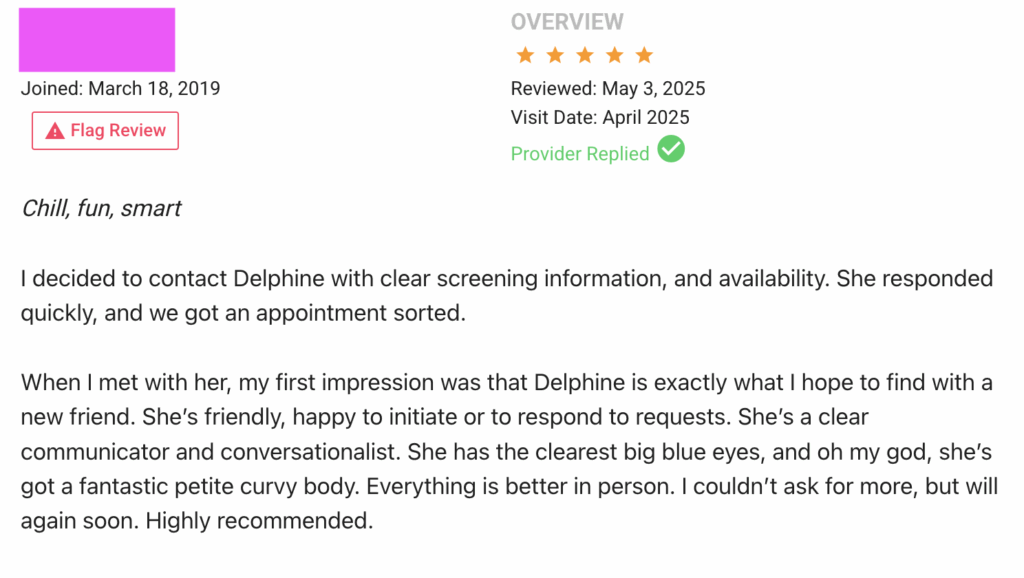 In my opinion, the helpful information for a review is whether or not the provider was nice/pleasant, how smoothly the booking process went, and whether they looked like their photos. Other information that might be good to include in a review is how the space was (if the provider was hosting), and whether or not the provider was on time. But, all the rest is subjective. Someone’s favorite blow job might be another person’s nightmare, after all.